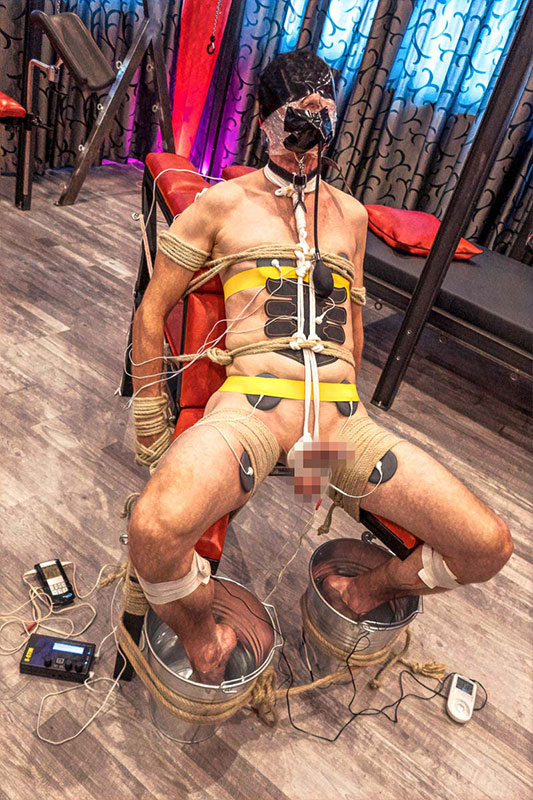 Sie zwängt meine Füße in die Eimer und bindet diese an den Bock, damit sie nicht wegrutschen können. Ok, jetzt verkabelt sie mich und platziert großflächige Elektrodenpads auf Brustwarzen, Bauch, Leistengegend, Oberschenkel und Unterschenkel, jeweils ein Kabel schließt sie noch an die Metallkübel.