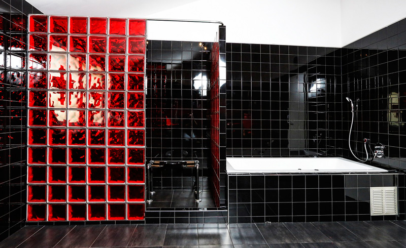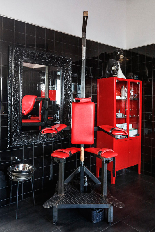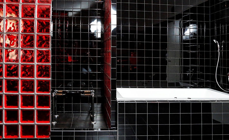 Unsere Penthouse Klinik ist ein Fest für die Sinne. Schwarzer Fußboden, schwarze, glänzende Fliesen an den Wänden und eine Einrichtung, die mit einem satten Rot Akzente setzt.