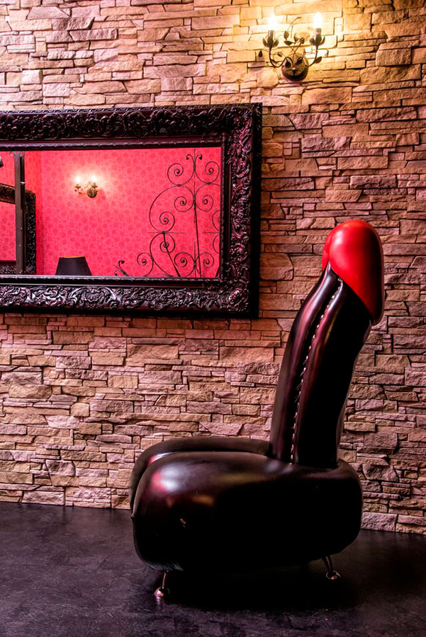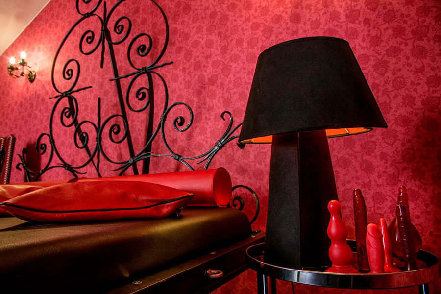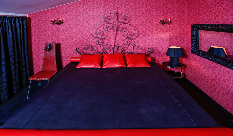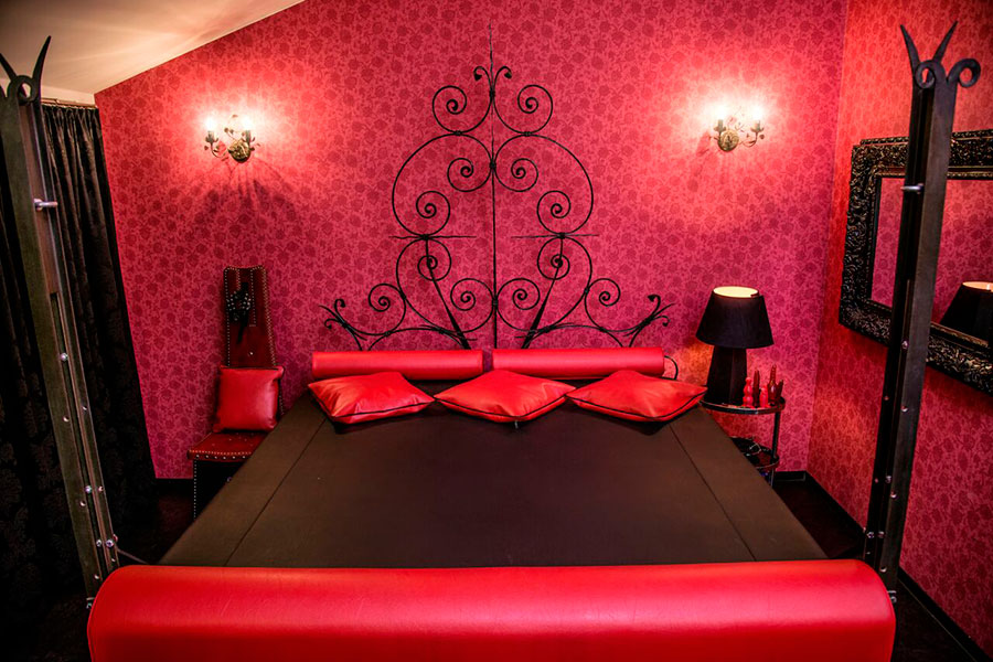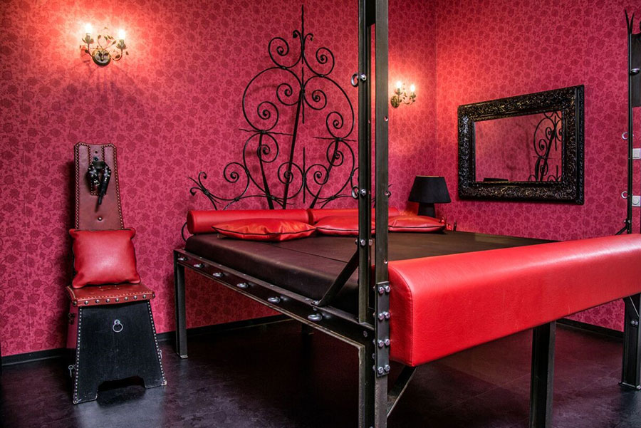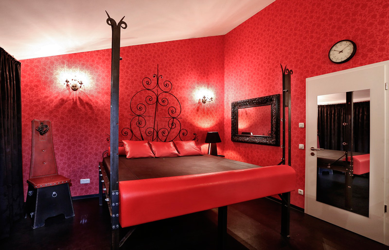 Ausgestattet mit einem großen mit schwarzem und rotem Leder bezogenen Fesselbett, diversen Stühlen und Böcken und unzähligen Toys, Paddeln und Seilen, lädt die Pariser Suite ein das eigene Kopfkino Realität werden zu lassen.