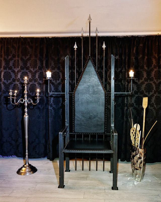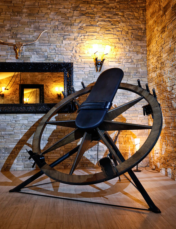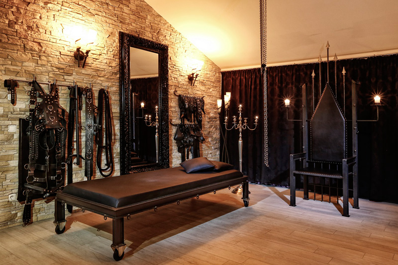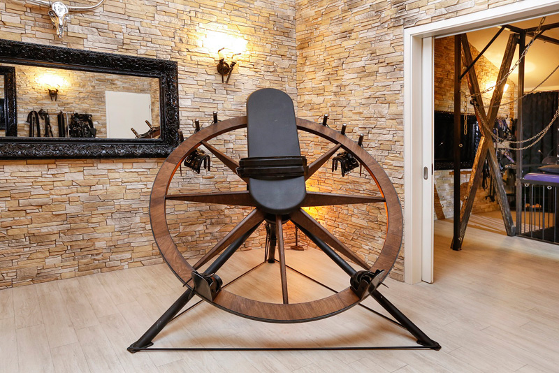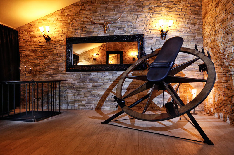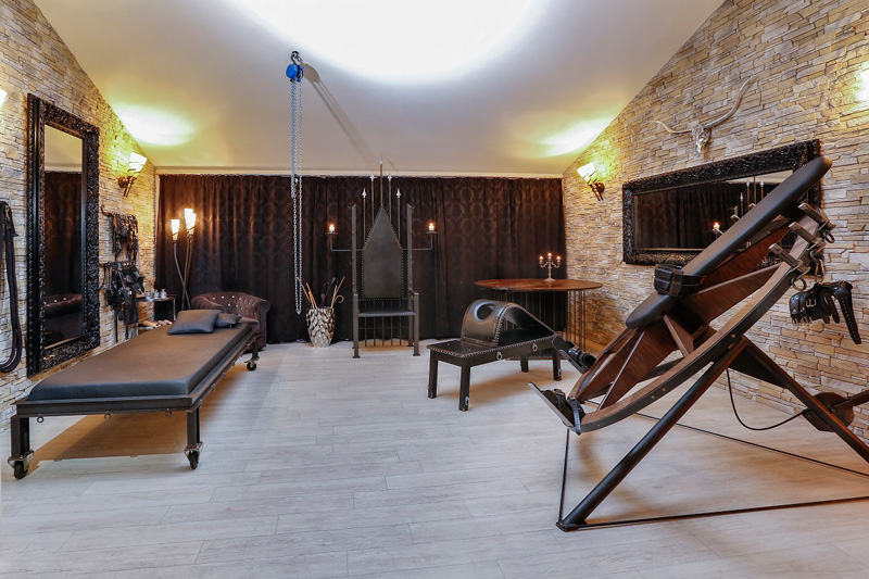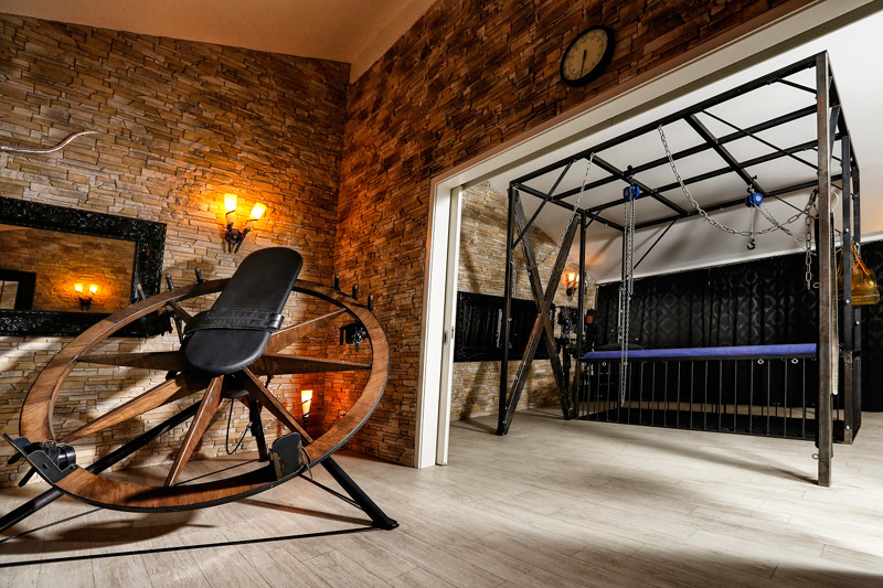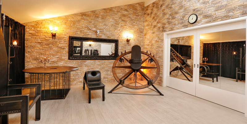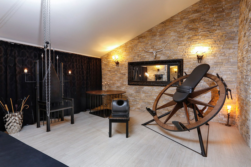 Ausgestattet für den Liebhaber des BDSM bietet dieser Thronsaal neben Flaschenzügen diverse Gerätschaften wie Böcke und Fesselstühle. Das Highlight des Thronsaals ist sicherlich unser antikes Dreh-Rad. Große Spiegelflächen zeigen auch hier eine weitere Seite im Spiel.