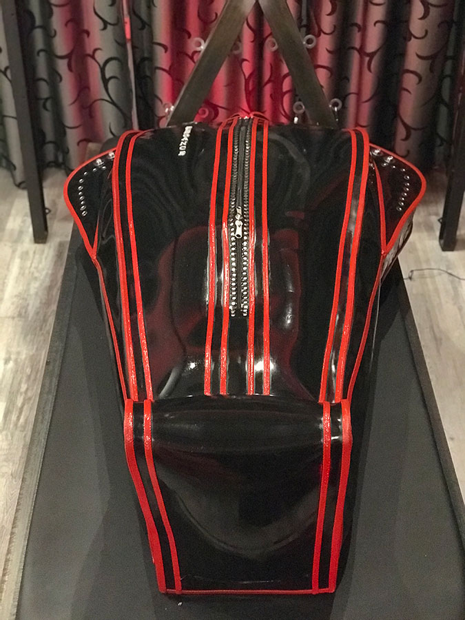 Ein Latextraum erfüllt sich für Dich! Du kennst das Gefühl, in einem Bondagesack eingeschlossen zu sein? Das ist nichts gegen das Erlebnis, den Latex-Sarkophag zum ersten Mal zu benutzen. Mit zwei separaten Luftkammern wirst Du das Gefühl verspüren, im Latexhimmel zu schweben und doch ist dieser Sarkophag ausbruchsicher gestaltet und auch für Langzeitaufenthalte geeignet. An den Seiten sind zwei Smellbags angebracht, die nach Belieben mit dem Kopfteil verbunden werden können.
